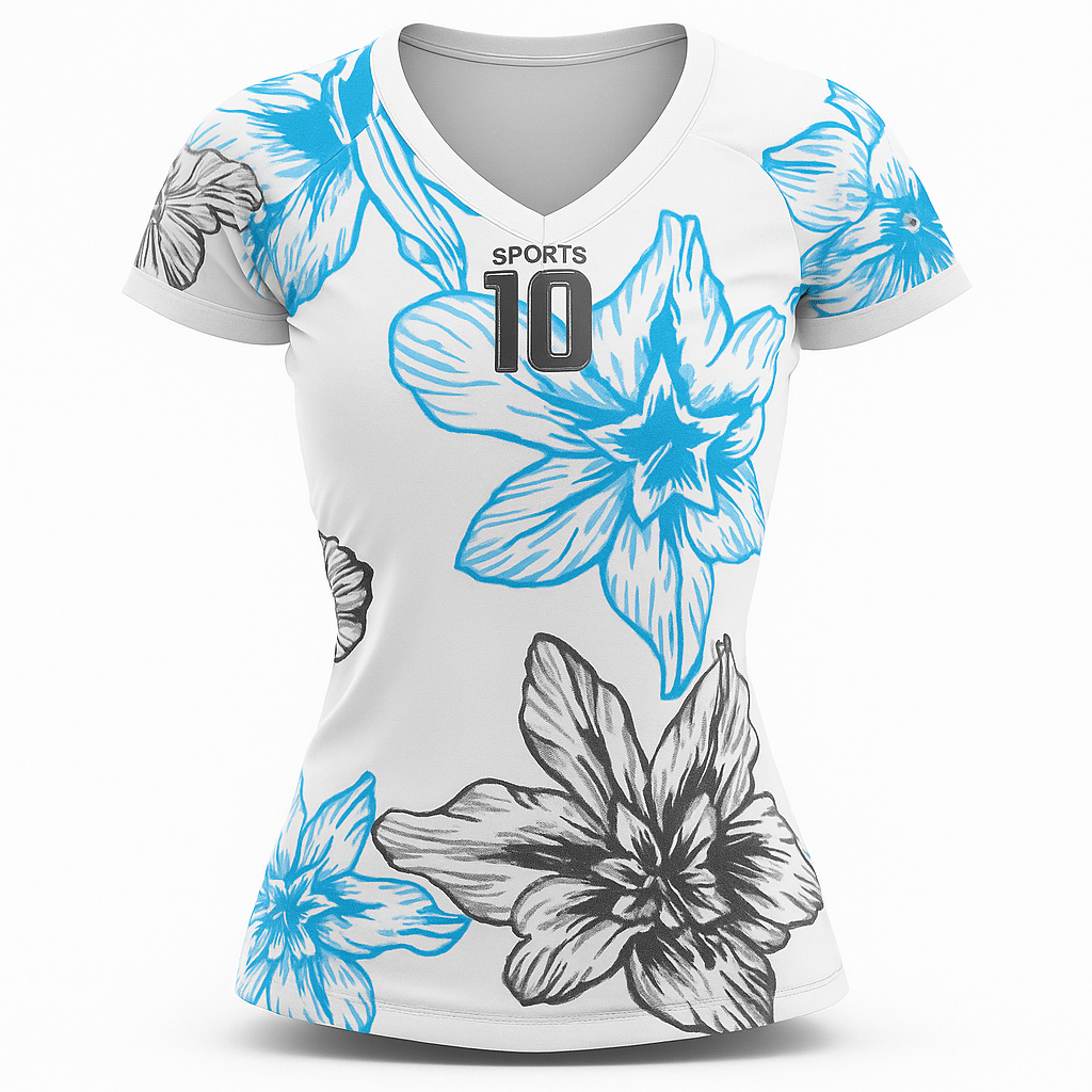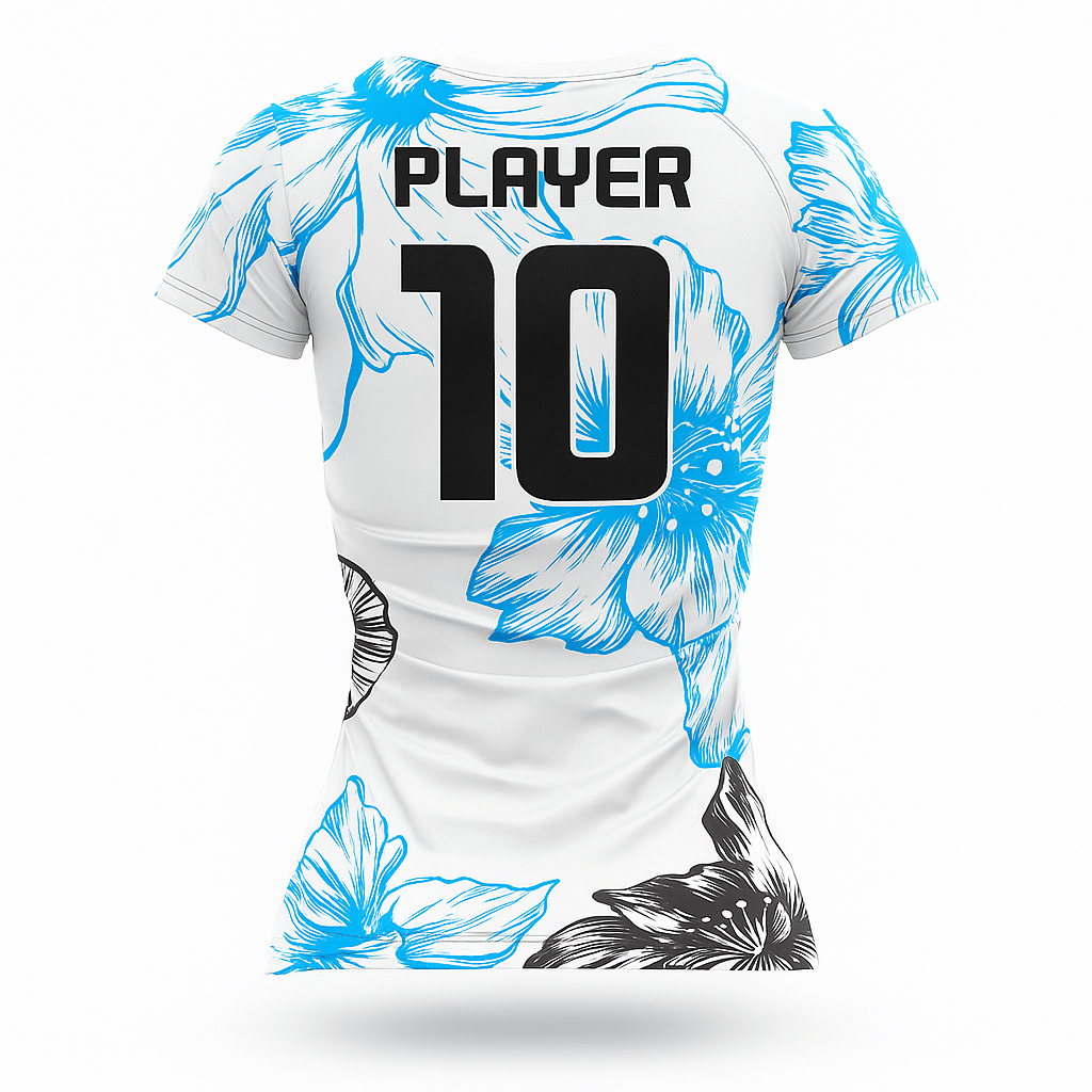 La coupe ajustée et féminine met en valeur la silhouette tout en offrant une grande liberté de mouvement, grâce à la conception raglan. Le design est sublimé par un imprimé floral bleu et noir sur fond blanc, élégant et dynamique. Le dos du maillot est personnalisable avec nom et numéro, idéal pour les équipes.