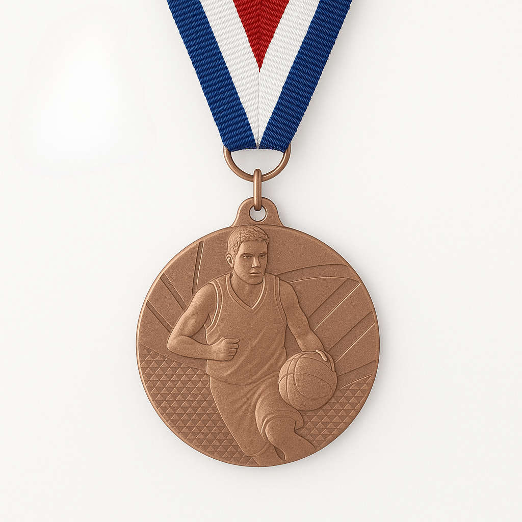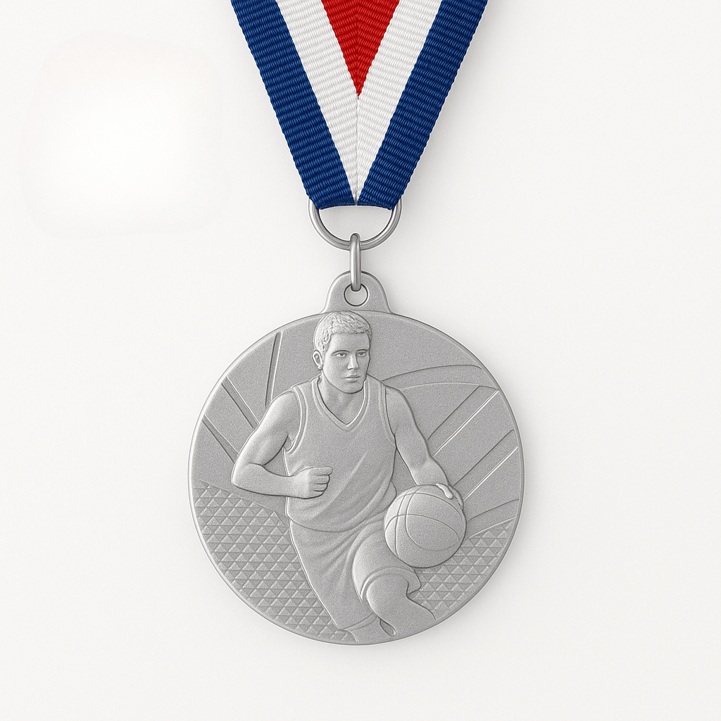 Ce modèle présente une forme ronde de 50 mm de diamètre avec un motif en relief détaillé représentant un joueur de basket-ball en pleine course avec ballon. L’arrière peut être personnalisé selon les options choisies. Le bord de la médaille est lisse et sans aspérité pour une tenue confortable.