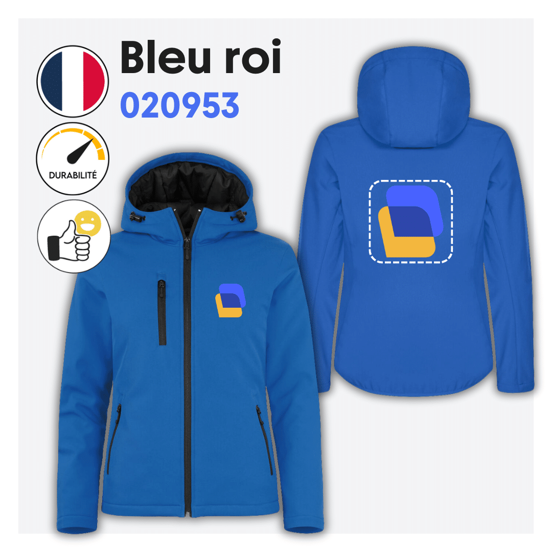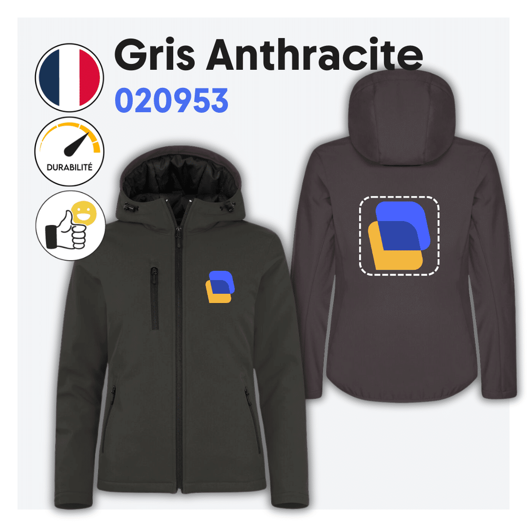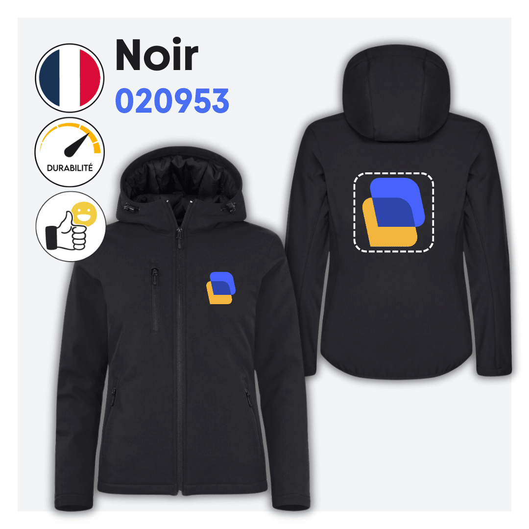 Veste softshell cintrée avec capuche, doublure noire et zip d’accès pour broderie. Elle dispose de 3 poches extérieures à zip inversé, 1 poche intérieure et d’une étiquette facilement détachable pour la personnalisation. Coupe nette et confortable.