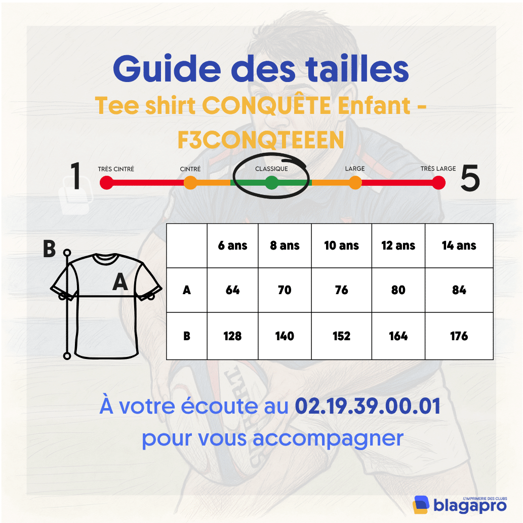 Disponible en plusieurs tailles enfants (116, 128, 140, 152, 164), le tee-shirt CONQUÊTE est proposé en plusieurs coloris : rouge/noir, noir/blanc, marine/blanc, gris clair/noir, noir/gris et jaune/noir. Cette large palette permet de répondre à différentes préférences et usages, tout en favorisant une personnalisation collective si nécessaire (clubs, associations…).