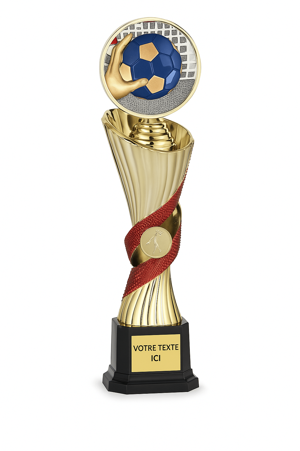 Conçu pour célébrer les performances sportives en handball, ce trophée élégant allie modernité et dynamisme grâce à une structure en ABS argenté rehaussée d’un disque résine représentant une main tenant un ballon (modèle DR35 inclus). Le contraste subtil entre les finitions dorées, argentées et le ruban rouge texturé crée un visuel impactant, parfait pour des cérémonies de remises de prix ou compétitions officielles.