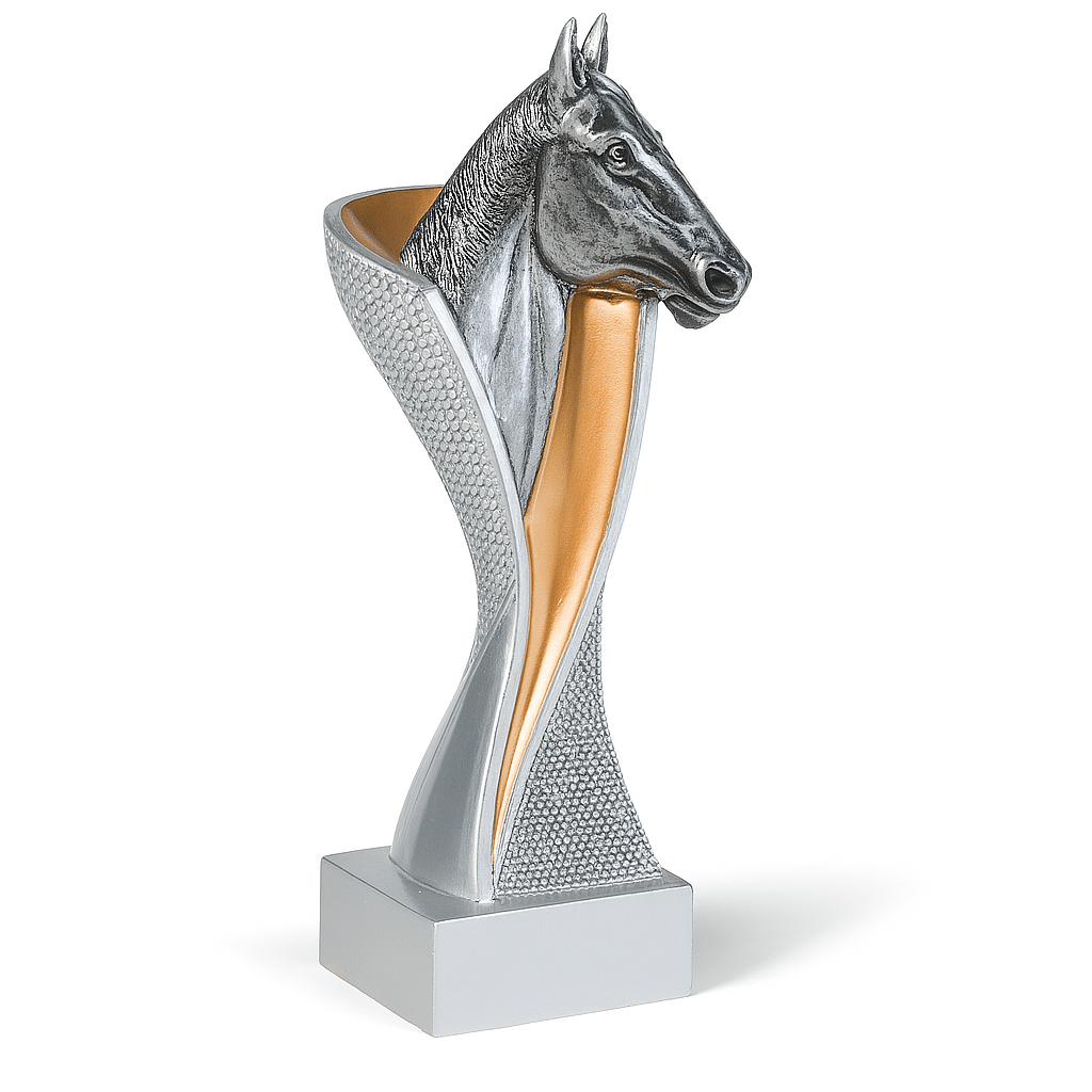 Trophée equitation en résine avec design cheval. Disponible en 3 tailles et couleur argent. Parfait pour récompenser des performances exceptionnelles. À partir de 12,05 € pour 12 trophées.