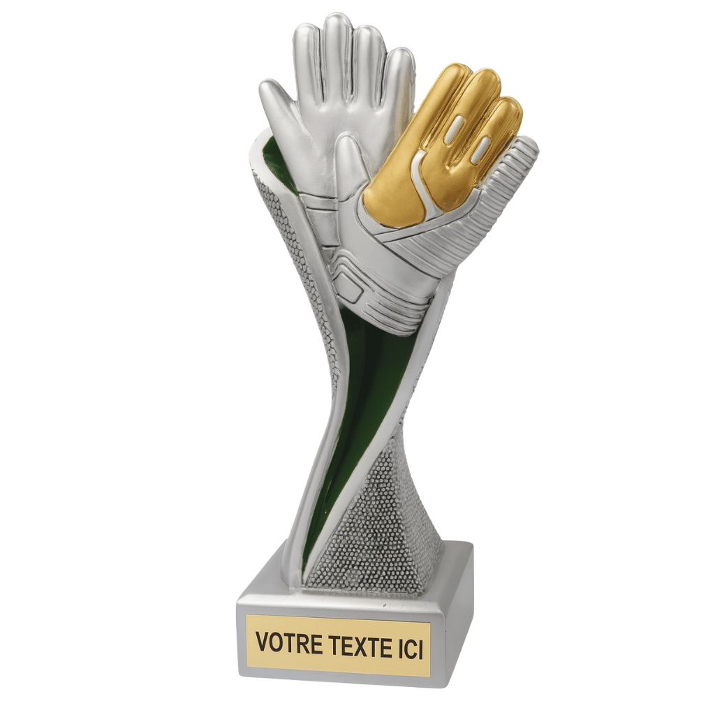 Trophée football en résine avec design gants de gardien. Taille : 24 cm. Disponible en argent/vert. Parfait pour récompenser des performances exceptionnelles des gardiens de but. À partir de 16,19 €.